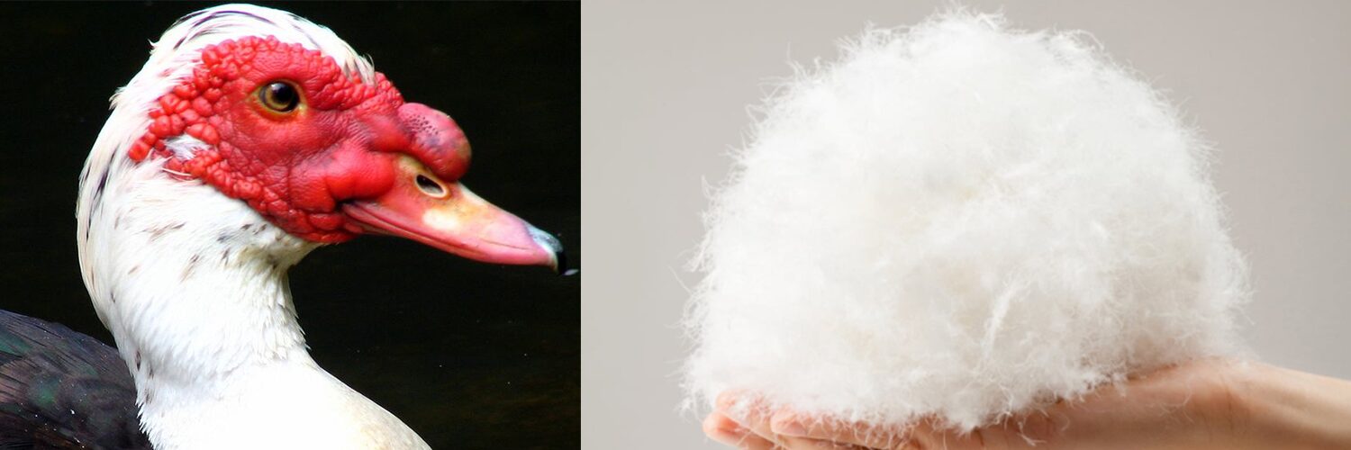 モスコビーダックはガチョウのように体が大きく、成長しきるまでに飼育期間が約95日と非常に長いため、羽毛が成熟しダウンボールが大きいことが特徴です。また、一般的な羽毛と比較して臭いが少ないことも優れた点の一つです。長期飼育期間により臭いの原因となる成長ホルモンが止まっており、一般のダックより臭いが極めて少ないです。